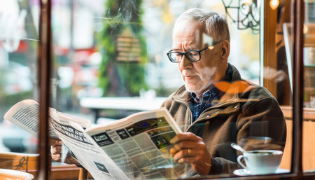 Elderly man with glasses reading newspaper attentively in a warm, cozy cafe environment.