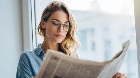 Young woman wearing glasses reads a newspaper while seated by a window, with soft natural light creating a bright atmosphere in the room