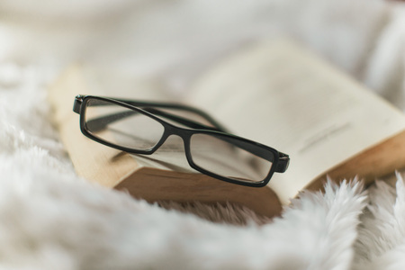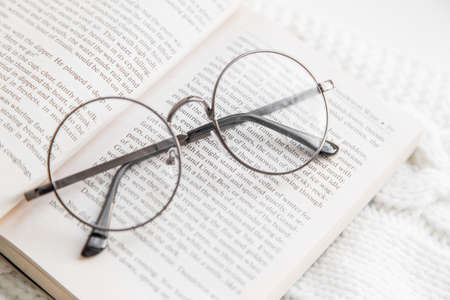 home comfort and winter evening. soft focus vintage glasses, book on a knitted rug flatlay. learning, profession editor, proofreader, writer