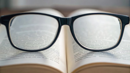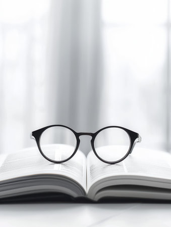 A pair of black eyeglasses rests on an open book, with a minimalist background.