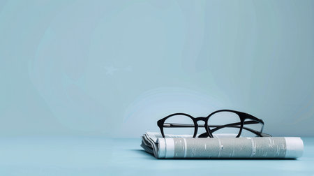 Black eyeglasses resting on a folded newspaper, positioned on a light blue surface.