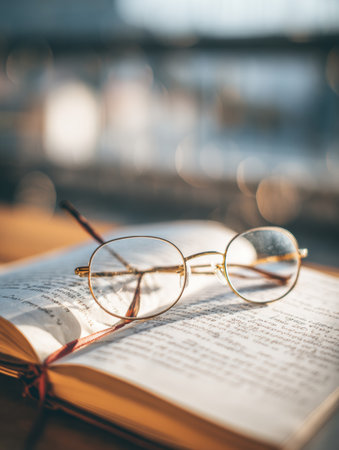 A pair of eyeglasses sits on an open notebook, creating a warm study scene with the gentle glow of natural light.