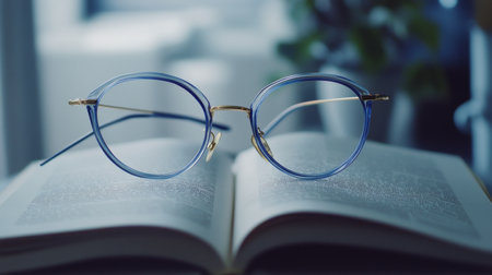 An elegant pair of eyeglasses lies on an open book, illuminated by a serene blue light, creating an inviting space perfect for relaxing reading and study sessions.