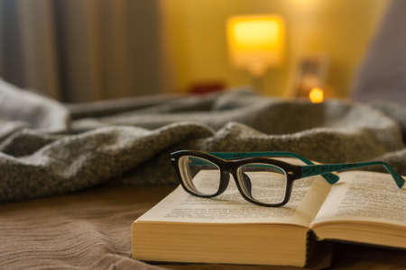 Bedroom cozy interior with blanket, open book with glasses and warm light. Home and relax concept.