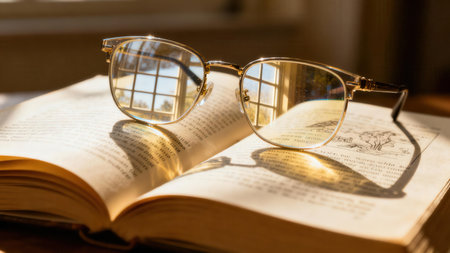 Shiny golden metal framed eyewear resting on aged paper pages, dramatically illuminated by warm afternoon sun streaming through a reflected window grid, highlighting the texture and detail.