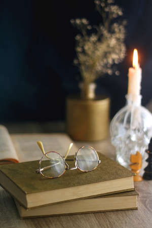 Old books, reading glasses, vintage chess pieces, lit candle and vase with gypsophila flowers. Dark academia concept. Selective focus.