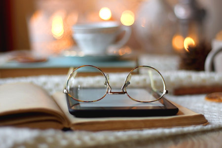 Open book and reading glasses. Candles and fairy lights in the background. Selective focus.