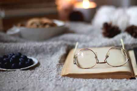 Candle holder with lit candle, open book and reading glasses, soft knitted blanket and wicker basket. Hygge at home. Selective focus.
