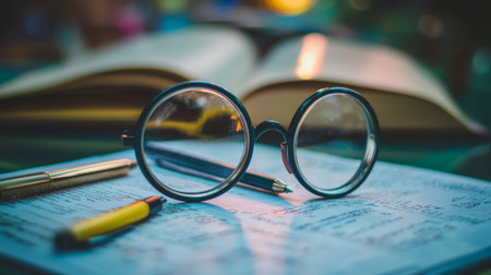 Colorful eyeglasses and pen are lying on an open book, suggesting a studious atmosphere focused on learning and education