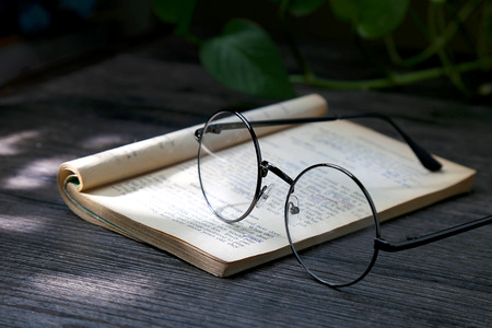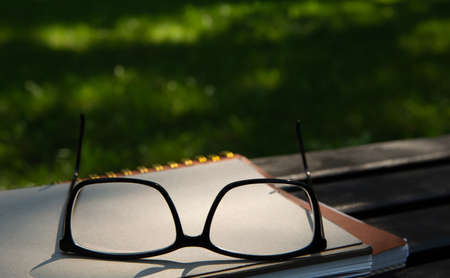 Reading glasses on blank notebook on wooden floor, outdoor day light, education concept