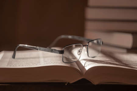 Open book with glasses lying on the pages. Selective soft focus. Toning. Copyspace.