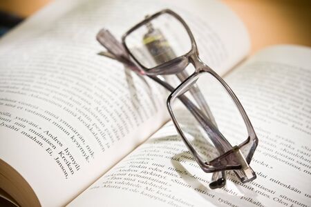 An open book with glasses on top of the pages. Selective focus points. Blurred background