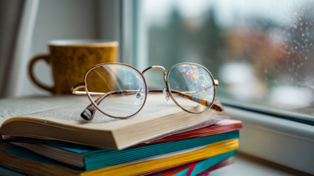A warm and inviting scene featuring stylish glasses resting on an open book atop colorful stacked books, with a cozy mug nearby, all illuminated by natural light through a rain-kissed window.