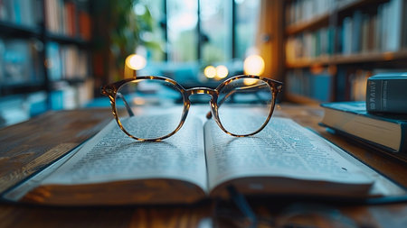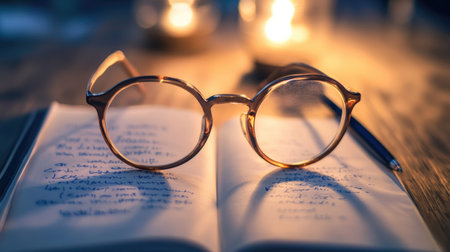 A pair of stylish blue glasses is placed on an open book, surrounded by soft lighting that enhances the cozy atmosphere of a study space at night.