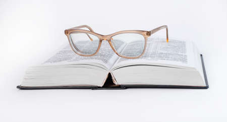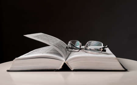 Glasses at open book. Education concept. Bible, dictionary reading. High quality photo