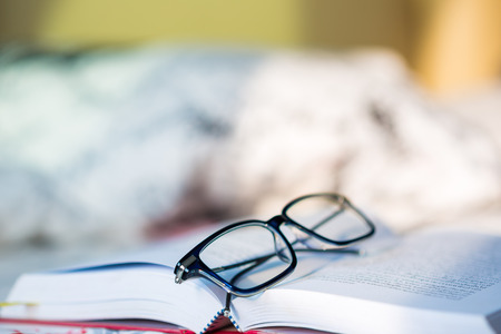 Books and glasses symbolizing the concept of reading in bedroom background, Sign of studying