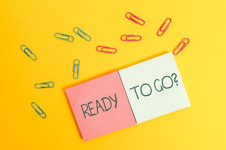 Writing note showing Ready To Go Question. Business concept for asking someone if he is prepared or packed his things Colored square blank sticky notepads sheets clips color background