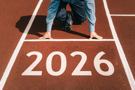 happy new year 2026. concept of starting a business or career in the new year. businessman preparing for running. opening a business in 2026. transition to a new level concept