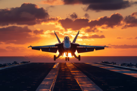 Fighter landing on aircraft carrier in sunset. AI generative.