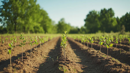 Young plants flourish in a sunlit field, showcasing the beauty of nature and the process of growth. A peaceful scene ideal for agricultural themes.