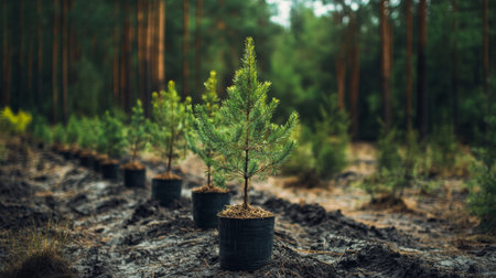 Young saplings are carefully planted in a lush forest environment, showcasing the importance of reforestation and nature conservation efforts.