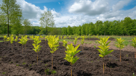Beautiful young saplings thrive in a lush field, showcasing the vital role of nurturing nature for a healthy ecosystem and sustainable environment.