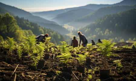 Person planting saplings in a rejuvenating forest, contributing to growth and sustainability of natural ecosystem. Generative AI