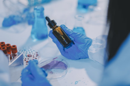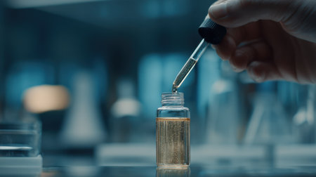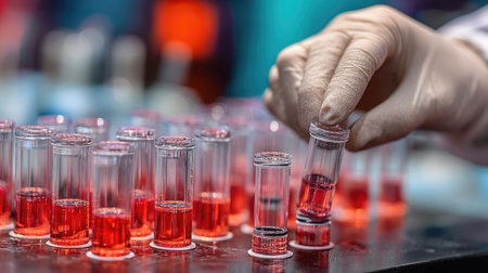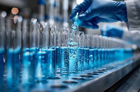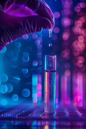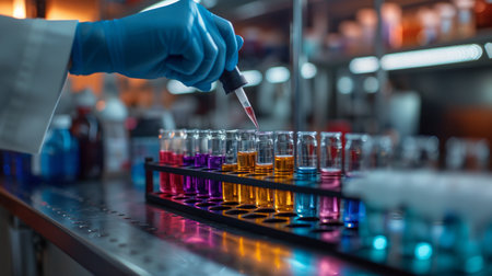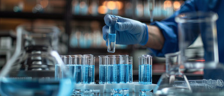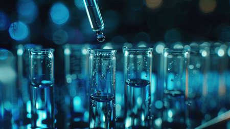 AI generated close up of hand in dark glove using dropper above row of glass test tubes in modern laboratory with cool blue tones and soft orange bokeh lights conveying focus and precision