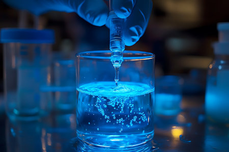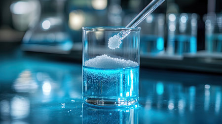 A vivid scientific image depicting a blue liquid in a beaker, showcasing a pipette dropping sugar crystals onto a glossy lab table, highlighting precision in experiments.