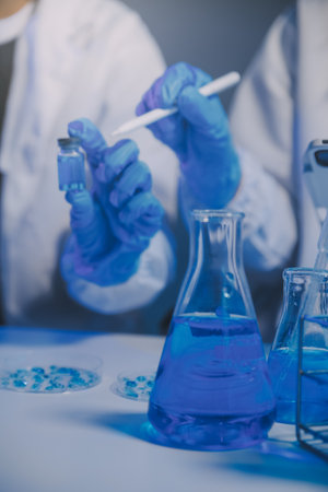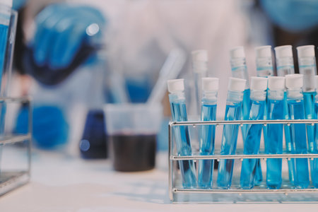 hands of scientists hold a glass tube filled with blue chemical liquid for research and analysis in a laboratory.