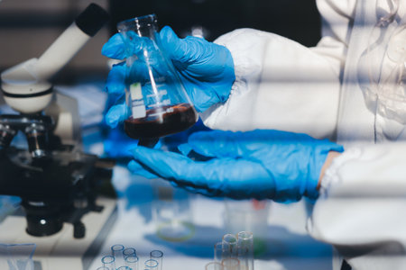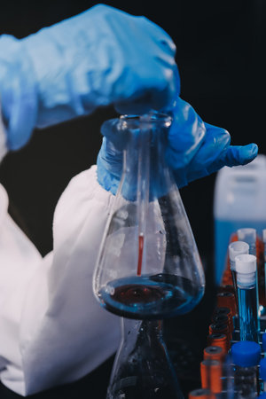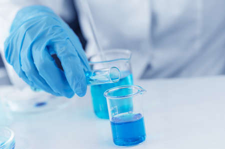 Scientist with blue gloves experimenting with colorful liquids in glass flasks in a lab. Concept of science, chemistry, research, experiment and analysis.