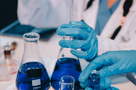 A scientist wearing gloves is carefully pouring blue liquid into a conical flask in a laboratory setting, surrounded by various scientific equipment.