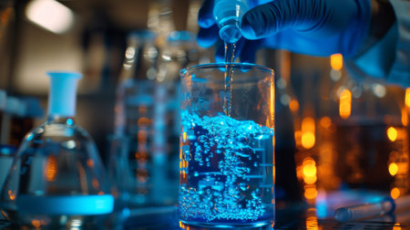 A scientist wearing gloves is carefully dripping blue liquid from a dropper into a glass beaker in a laboratory setting, highlighting a chemical experiment.