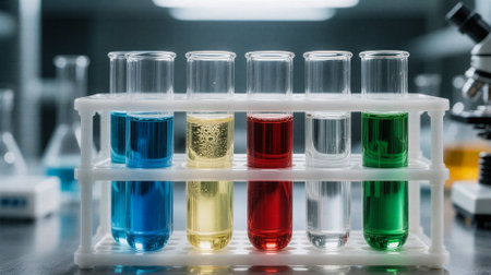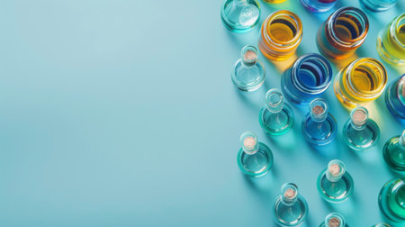 A vibrant laboratory scene featuring glass flasks with colorful liquids, highlighting scientific experimentation and research in a modern environment.
