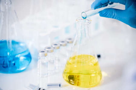 The scientist test the natural product extract, oil and biofuel solution, in the chemistry laboratory.