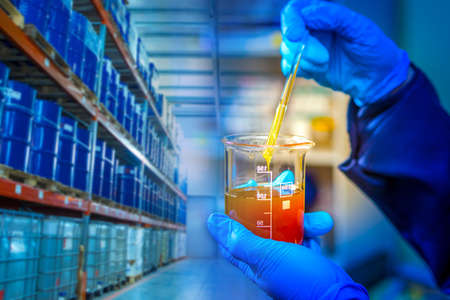 Hands holding flask. Checking the quality of crude oil. Oil product warehouse. Laboratory assistant in a warehouse with barrels. Man takes samples petroleum