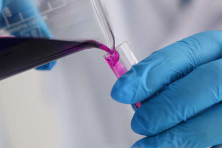 Decanting a violet liquid into a graduated cylinder in molecular laboratory
