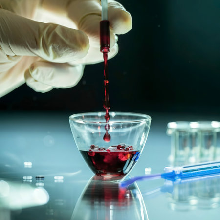 Medical laboratory. A hand in a medical glove pours blood into a petri dish for analysis. Laboratory tests