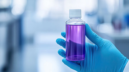 A close-up of a bottle of purple mouthwash held in a gloved hand, against a clean clinical background.
