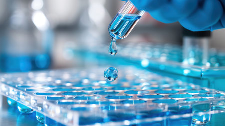 This image showcases a scientific setup where a pipette is precisely dropping blue liquid into a multi-well plate in a laboratory, emphasizing research and analytical processes.