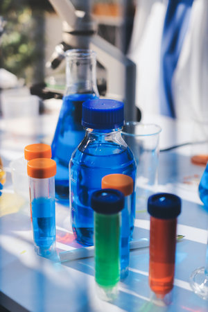 blue liquids in transparent flasks in the laboratory. test or research in lab. Technician testing chemistry lab experiment