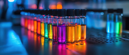 Rows of small vials containing vibrant, glowing scientific samples sit on a laboratory bench, backlit with bokeh lights