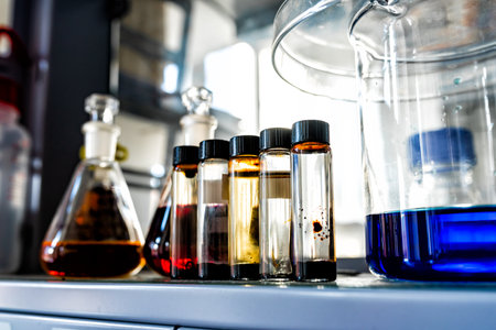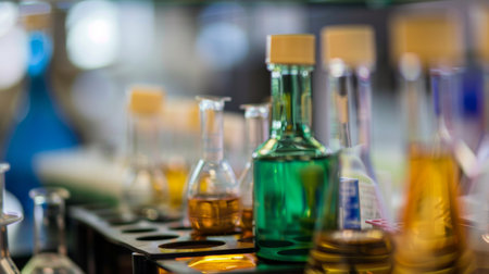 Closeup of laboratory glassware filled with orange and brown oily liquids, science and research background, selective focus