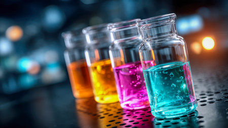 A collection of vials containing vibrant liquids is displayed on a lab workbench during an experiment.
