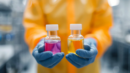 A scientist in a yellow lab coat presents two test tubes containing vibrant colored solutions, actively engaged in a scientific experiment within a laboratory environment.