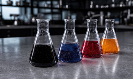 A vibrant laboratory scene featuring glass flasks with colorful liquids, highlighting scientific experimentation and research in a modern environment.