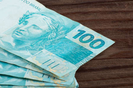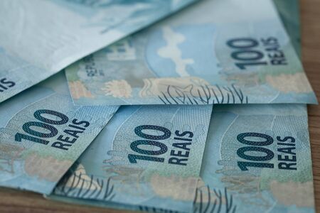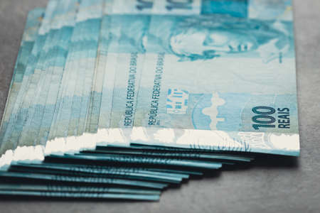 Brazil money, Stack of 100 reais banknotes standing in harmony vertically on the table, Business concept