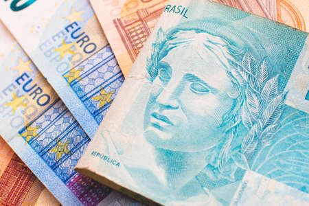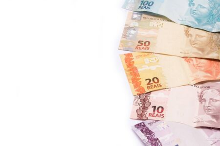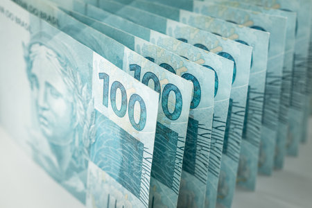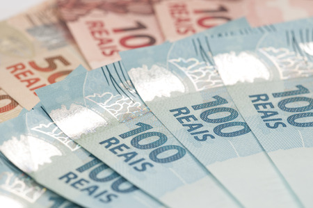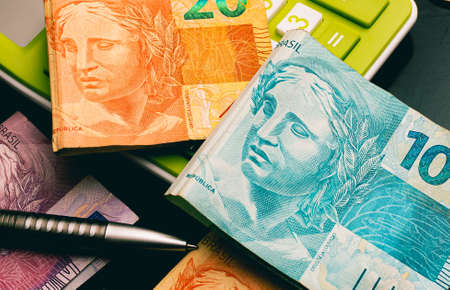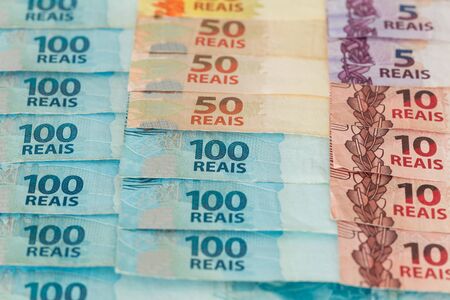 Closeup of varied values of Brazilian money. Economy of Brazil concept image.