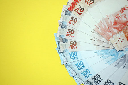 Close up of brazilian reais money bills in big amount on yellow table. Pile of Brazil real currency banknotes. Finance and banking concept