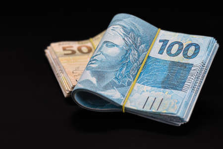 hundred reais and fifty reais banknotes, debt or financing concept, isolated black background